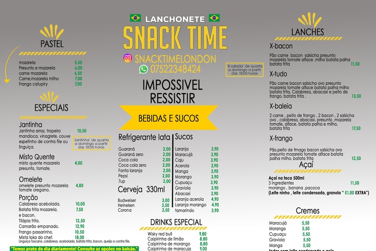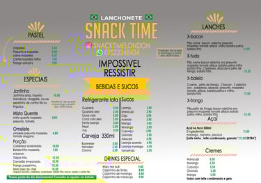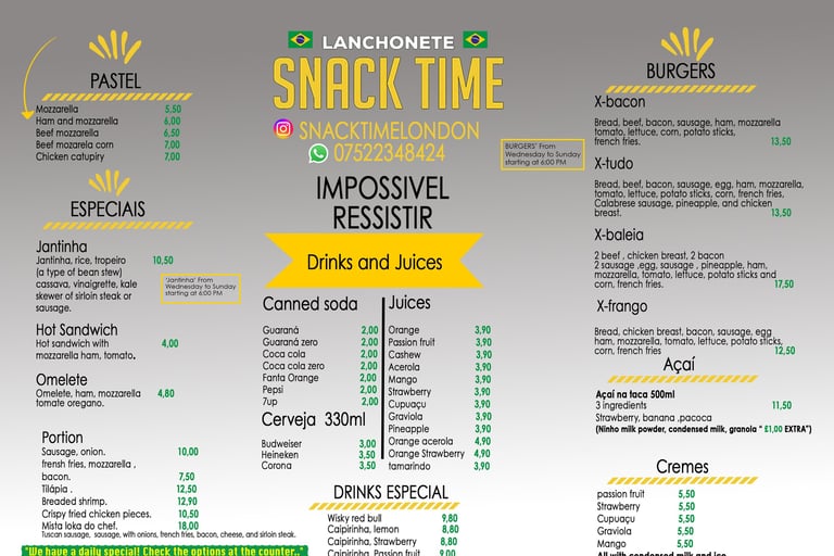 Snack Time é um restaurante brasileiro localizado em Londres, no bairro NW10, trazendo o melhor da culinária do Brasil para você. Oferecemos um cardápio com pratos típicos, lanches, salgados e sobremesas tradicionais em um ambiente acolhedor e familiar. Venha saborear autênticos sabores brasileiros, preparados com ingredientes frescos e muito carinho. Ideal para quem sente saudade de casa ou deseja conhecer a verdadeira gastronomia do Brasil no coração de Londres.