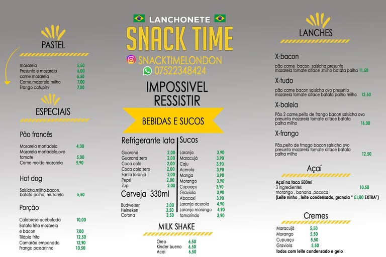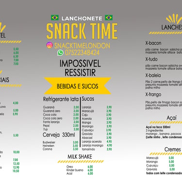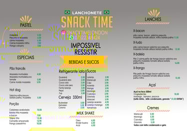 Snack Time é um restaurante brasileiro localizado em Londres, no bairro NW10, trazendo o melhor da culinária do Brasil para você. Oferecemos um cardápio com pratos típicos, lanches, salgados e sobremesas tradicionais em um ambiente acolhedor e familiar. Venha saborear autênticos sabores brasileiros, preparados com ingredientes frescos e muito carinho. Ideal para quem sente saudade de casa ou deseja conhecer a verdadeira gastronomia do Brasil no coração de Londres.
